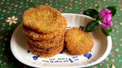 Cho bột chiên xù ra dĩa, lấy 1 muỗng ăn cơm bột bí đỏ vo tròn, rồi cho viên bột vào bột xù, lúc này mới dùng tay ấn viên bột cho dẹp dẹp & viên bột tự bám dính bột xù (làm 2 mặt của viên bột giống nhau). Hai mặt bánh lăn đều qua bột xù.