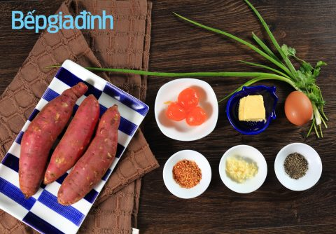 - Khoai lang bóc vỏ, dùng nĩa nghiền nát. Lòng đỏ trứng đánh tan. Cho khoai lang vào tô, thêm lòng đỏ trứng muối, hành lá, muối, tiêu, ớt bột, bơ lạt vào trộn đều.