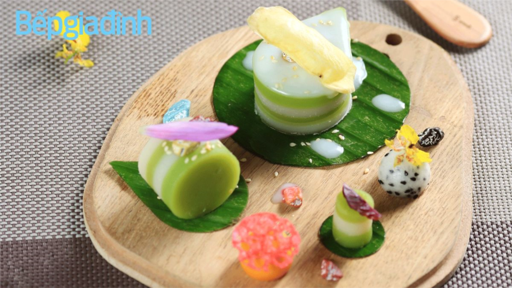 - Khi bánh chín lớp cuối cùng, đem khuôn ra khỏi xửng, để bánh nếp lá dứa nguội hoàn toàn, lóc bánh ra. Khi ăn rưới nước cốt dừa, rắc mè lên.