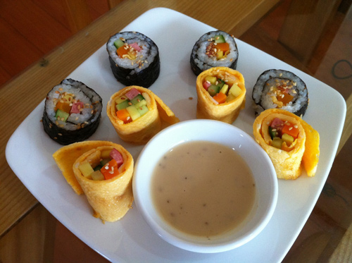 Dưa chuột, cà rốt, xúc xích, trứng chiên và lá rong biển.