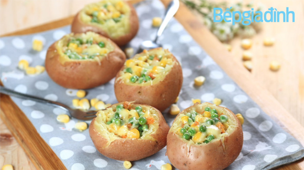 - Cho nhân rau củ vào khoai tây, rắc phô mai bào lên cho vào lò nướng cho phô mai tan chảy là được.