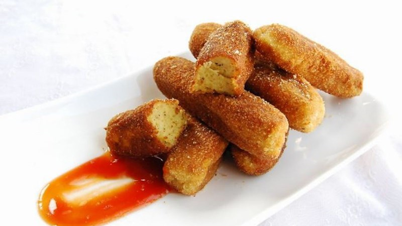 - Cho dầu vào chảo, dầu nóng cho xúc xích khoai tây nghiền vào chiên vàng giòn lớp mặt thì vớt ra thấm ráo dầu.