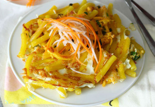 Đây là món ăn quen thuộc được nhiều người yêu thích. Nui vàng ruộm, giòn giòn dai dai kết hợp trứng khiến món ăn ngon khó thể bỏ qua