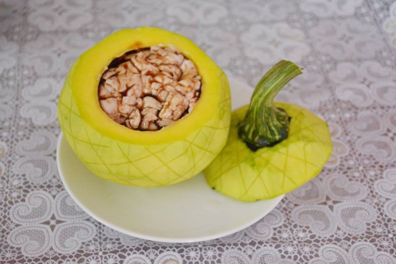 - Bí đỏ để chưng óc heo nên chọn bí non, quả vừa tay. Bí mua về gọt vỏ, cắt 1/3 ở phần cuống làm nắp, móc sạch ruột, rửa sạch. Có thể tỉa hoa hoặc đơn giản là khứa vài đường ca-rô trang trí cho đẹp mắt.