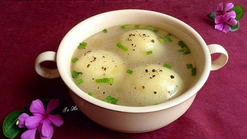 - Cho nước dùng vào nồi, với thêm 1/2 muỗng nước tương, 1/2 muỗng cafe đường nấu sôi với lửa vừa. Nước dùng sôi cho từng viên bột bánh vào. Bánh nổi lên cho sôi nhẹ thêm 5 phút là bánh chín hoàn toàn.